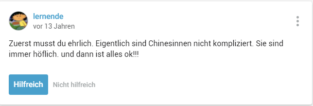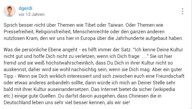 导语:德国版知乎“gutefrage”上出现了一个恋爱求助帖:德国人楼主对一位中国女同事心生爱意,但在对中国文化习俗不了解的情况下,他怕贸贸然坏了她的规矩,由此引出了一系列回复。从中我们也窥见了德国人对中国女性的印象。