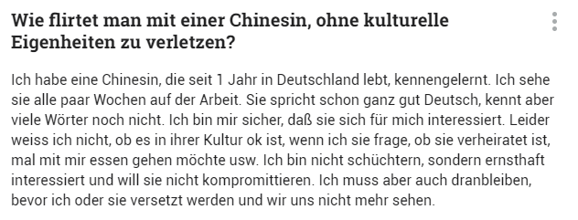 “我认识了一位在德国生活一年的中国女人,每隔几周我都会在工作中看见她。她德语说得已经很不错了,但是还是有很多词不认识。她肯定对我有意思。但是我不知道在她的文化习俗里,我问她结婚了没有,或者问她想不想和我出去吃饭这种话合不合适。我不害羞,我是真的对她感兴趣,也不想让她尴尬。但是在我或她升职,俩人再也见不到面之前,我必须坚持下去。”