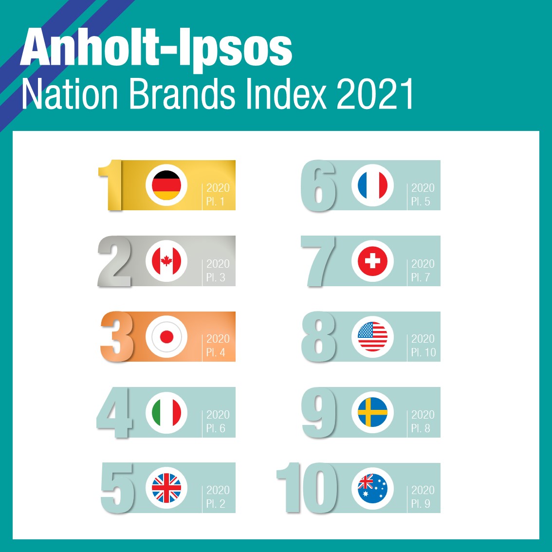 Die Ergebnisse stammen aus der aktuellen Erhebung der Tracking-Studie »Anholt-Ipsos Nation Brands Index« (kurz: NBI). Bei der jährlich durchgeführten Online-Umfrage wurden von Juli bis August 2021 über 60.000 Online-Interviews in 20 Ländern mit Personen ab 18 Jahren durchgeführt.