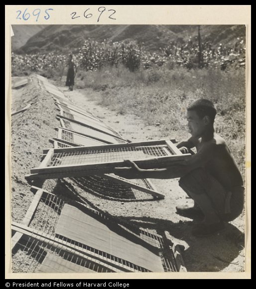 Boy laying out racks of incense to dry in courtyard at incense factory west of Ts'a-ho Village in the Lost Tribe country