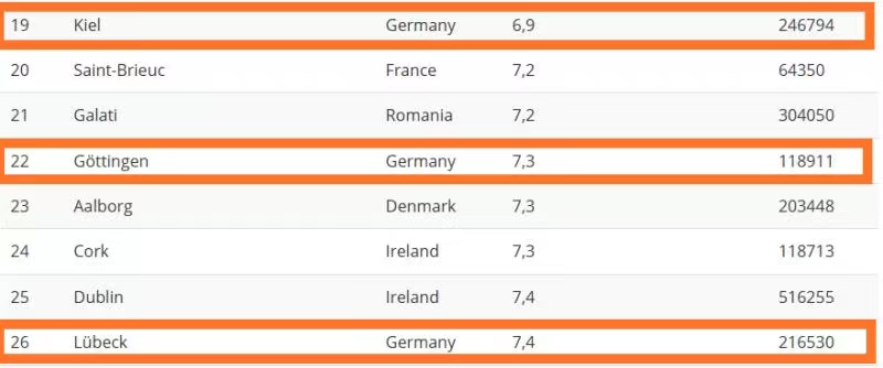 Die besten Werte unter den deutschen Städten erzielen Kiel (Rang 19), Göttingen (22) und Lübeck (26). Die schlechtesten sind Nürnberg (234), Berlin (238) und Gelsenkirchen (245). München liegt an Position 54, Hamburg an 161. Stelle.