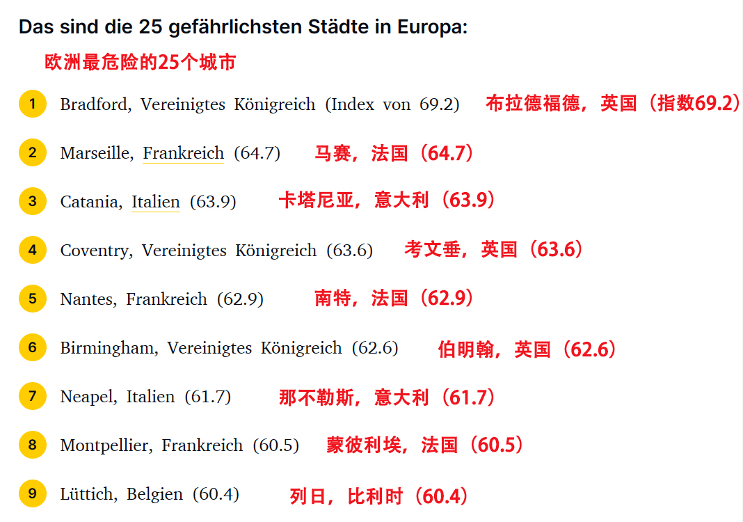 从这份榜单中可以看出,德国西边的两个邻居——比利时和法国,加起来上榜的最危险城市数量就有9个,接近榜单(25个城市)的五分之二!