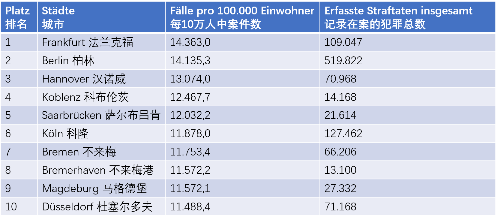 除此之外,德国国内最危险城市的排名也是少不了的,看看有没有你所在的城市上榜了的~