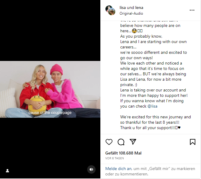 两人在帖子中写道,她们要感谢所有2000万粉丝在过去 8 年中对她们的支持。她们表示:“我们已经大不相同,期待着各奔东西......我们彼此相爱,但不久前,我们意识到是时候专注于我们自己了。我们永远是Lisa和Lena,只是现在更私密一些。”