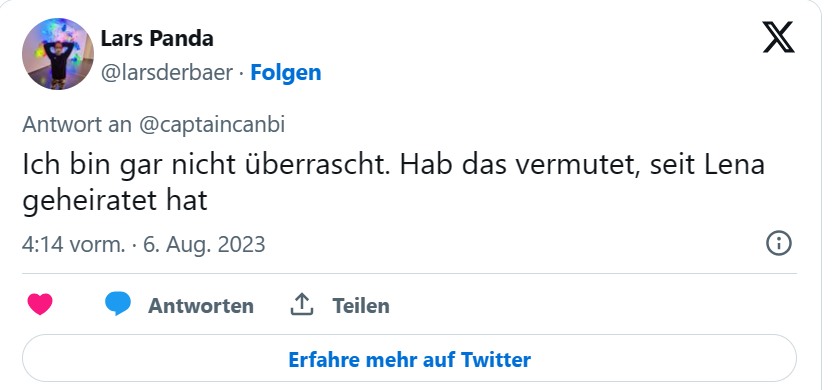 网友@Lars则表示,她一点都不惊讶,自从Lena结婚之后,她就猜到了。(Ich bin gar nicht überrascht. Hab das vermutet, seit Lena geheiratet hat)(虽然结婚的是Lisa......看来粉丝们确实傻傻分不清楚)