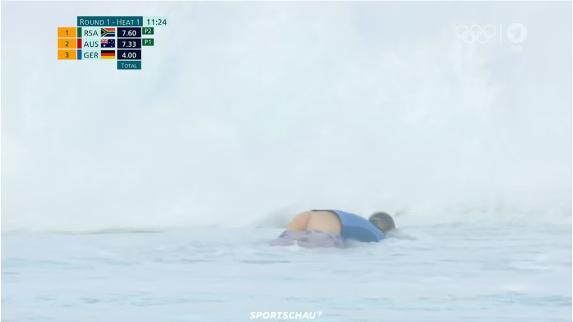 奥运会冲浪比赛中的意外惊喜:德国运动员蒂姆·埃尔特在预赛中被塔希提的一波浪掀掉了裤子,短暂地露了屁股。这是对奥运会决定将冲浪比赛安排在远离巴黎数千公里的塔希提海岸的一种态度表达吗?