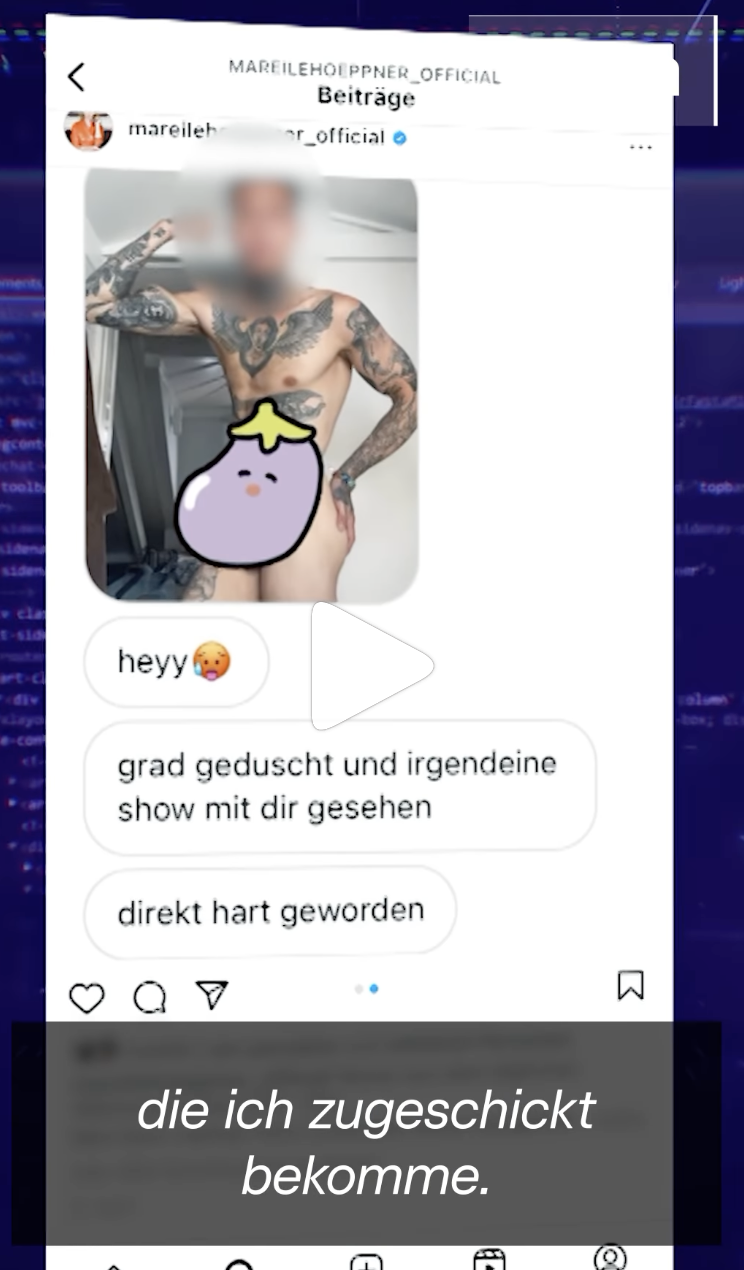 玛丽尔在RTL的一名女同事联系到了这名男子,并说服他接受采访。可是这名骚扰过上百位其她女子的Online-Wüstling——在网络上“放荡不羁的猥琐男”,却提出了一个奇怪的条件:他希望在接受采访时一丝不挂。