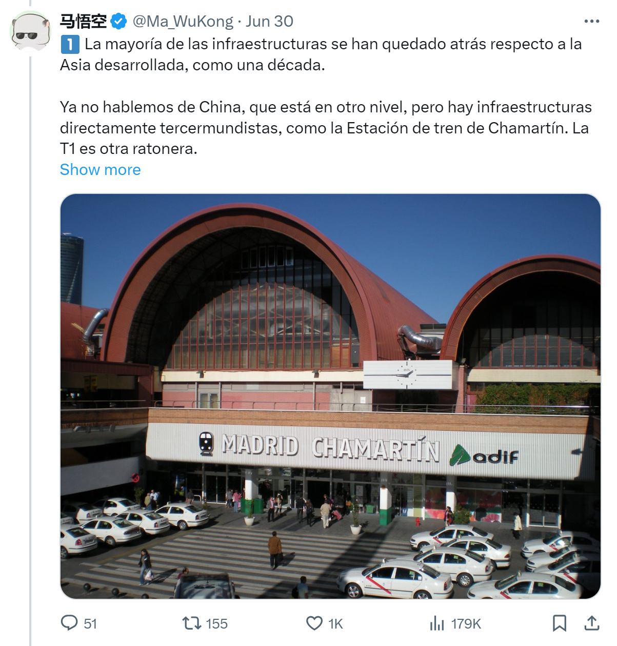 他提到的第一个也是最重要的观点是基础设施。根据这位用户的说法,西班牙的大多数基础设施在发展水平上“落后于发达的亚洲大约十年”。例如,他认为查马丁火车站和巴拉哈斯机场的T1航站楼“简直是三世界水平”。