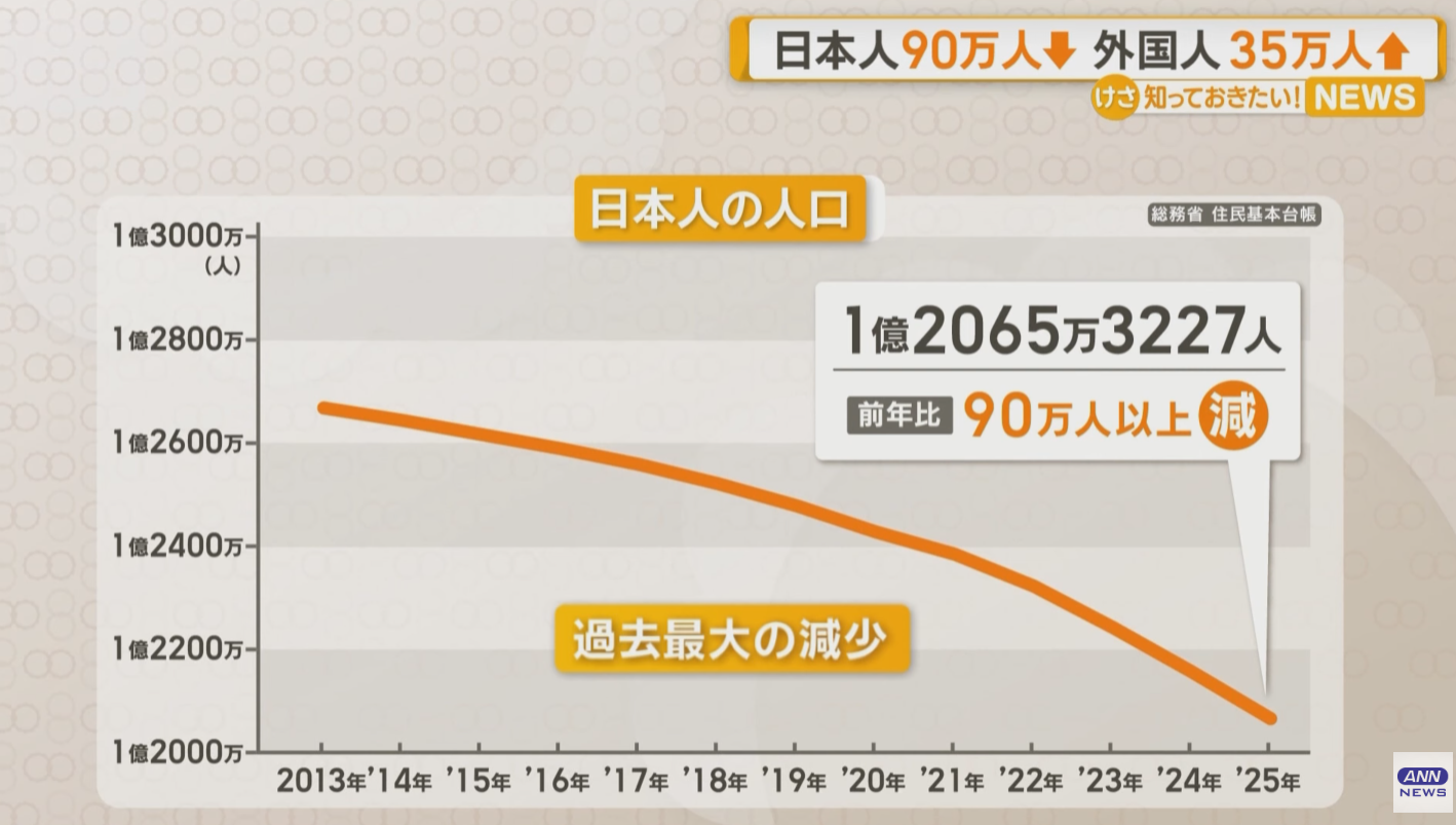 総務省は6日、住民基本台帳に基づく1月1日現在の人口を発表した。日本人は1億2065万3227人で、前年より90万8574人(0.75%)減った。減少数・率ともに過去最大だった。一方、外国人は前年比35万4089人(10.65%)増の367万7463人で、外国人の集計を始めた2013年以降、最多を更新した。