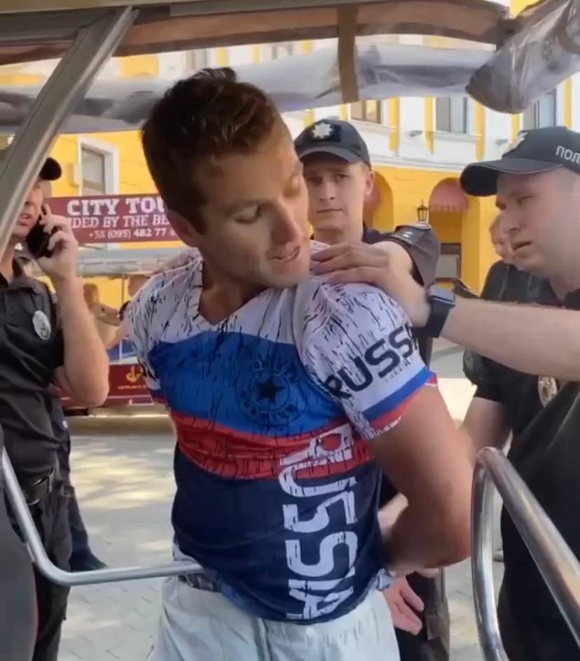 Пока на туриста надевали наручники, он успел пояснить суть своего теста: «Украина не свободная страна, потому что я прошелся в футболке "Россия" по городу и был задержан украинской полицией. Вы не свободное общество. В Украине не свободное общество».