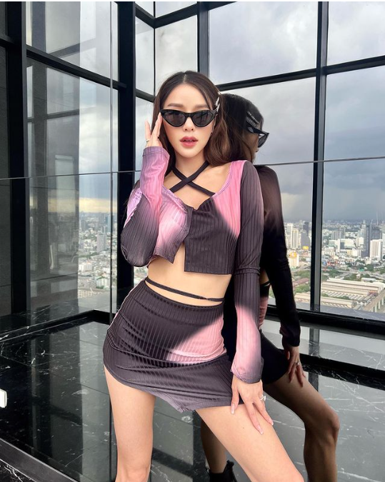 6. เสื้อยืดครอปสีดำ โชว์เอวเบา ๆ กับกระโปรงสีชมพูสุดเซ็กซี่