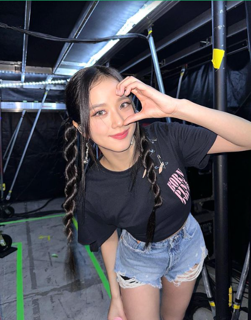 2. จีซูขอลุคสบาย ๆ ด้วยเสื้อยืดสีดำ ผูกเอวสักนิด กับกางเกงยีนส์ขาสั้นคู่ใจ