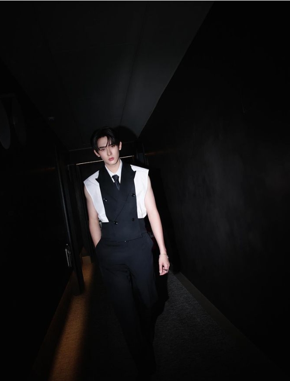 Book选择的是帅气温柔的风格,他穿的是一件精致的双层无袖衬衫,黑白交替非常好看,衣服的亮点是前面的部分像西装一样,搭配黑色长裤和黑色皮鞋,Book的又一个帅气造型就完成了。
