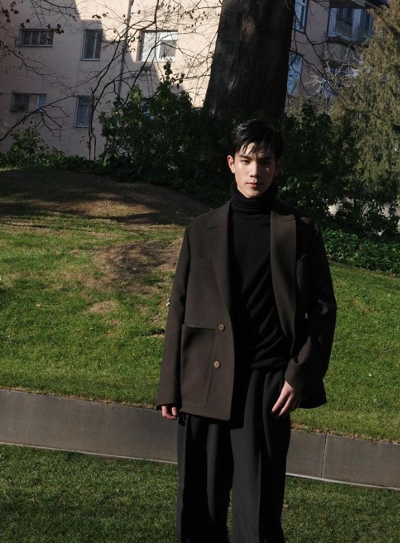 不得不说Fourth这身造型显得十分时尚,他穿了件黑色高领衣,外搭一件oversize的深灰色西装外套。Zegna的优秀之处在于西装版型工整好看。最后再搭配一双黑色皮鞋,Fourth的帅气成熟造型就完成了。