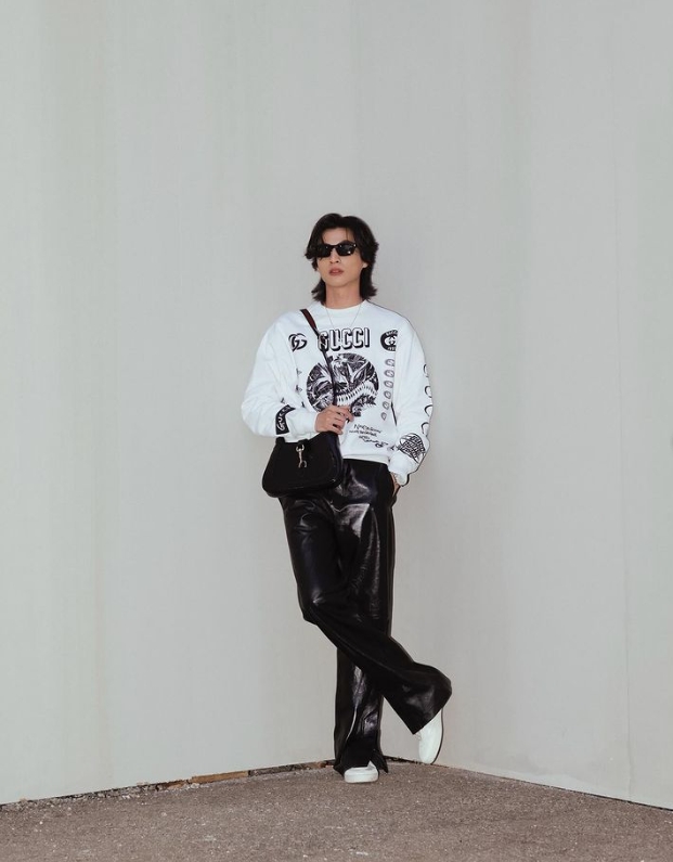 หนุ่มกลัฟเลือกใส่เป็นเสื้อยืดคอกลมสีขาวแขนยาวที่มีกิมมิคคือตรงเสื้อสกรีนลายคำว่า Gucci พร้อมกับลวดลายที่เท่แบบตะโกนมาก ๆ ใส่แมทช์กับตัวกางเกงหนังสีดำที่บอกเลยว่าเข้าคู่กันมาก และในส่วนของไอเทมเสริมลุคของหนุ่มกลัฟก็จะมีเป็นแว่นตากันแดด , สร้อยคอ , กระเป๋าแบบสะพายสีดำ และรองเท้า Sneakers แบบเท่ ๆ บอกได้เลยว่าเป็นลุคของหนุ่มกลัฟจากแบรนด์ Gucci ที่สุดยอดมาก
