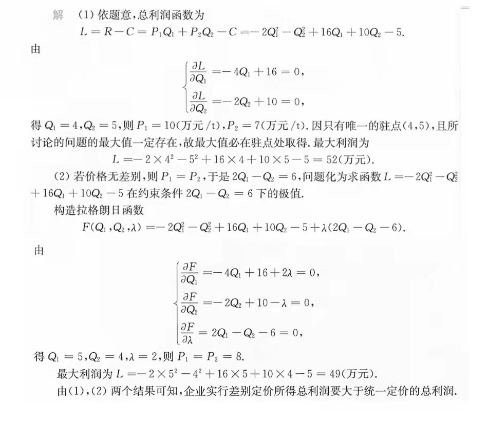 有两个问题 第一个:第小问说是实行价格无差别策略,那么p1应该是等于p2的,但是答案里面求出来的Q1Q2代入题中所给条件,p1p2并不相等,这是为什么呀?第二个:我没有用Q算,直接用p算,结果也不对...可是我觉得过程没有问题。麻烦看看我哪里写错了!