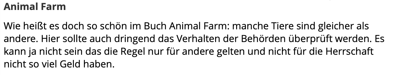 那本《动物农场》里怎么说的?“动物生而平等。” 是该好好审查德国官员的行为了。规则不能只适用于平民大众,而对统治阶级开放特权。