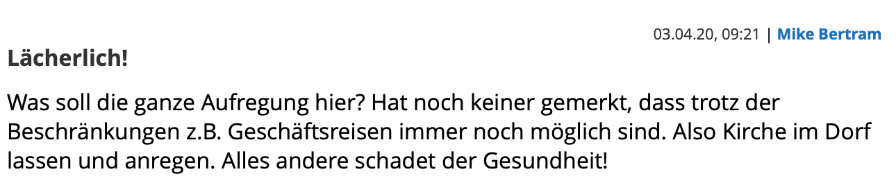 有什么大惊小怪的?没有人注意到,尽管有禁足令存在,但是公事旅行并不受限制。不要小题大做好嘛。不过做别的事情还是有害健康的。