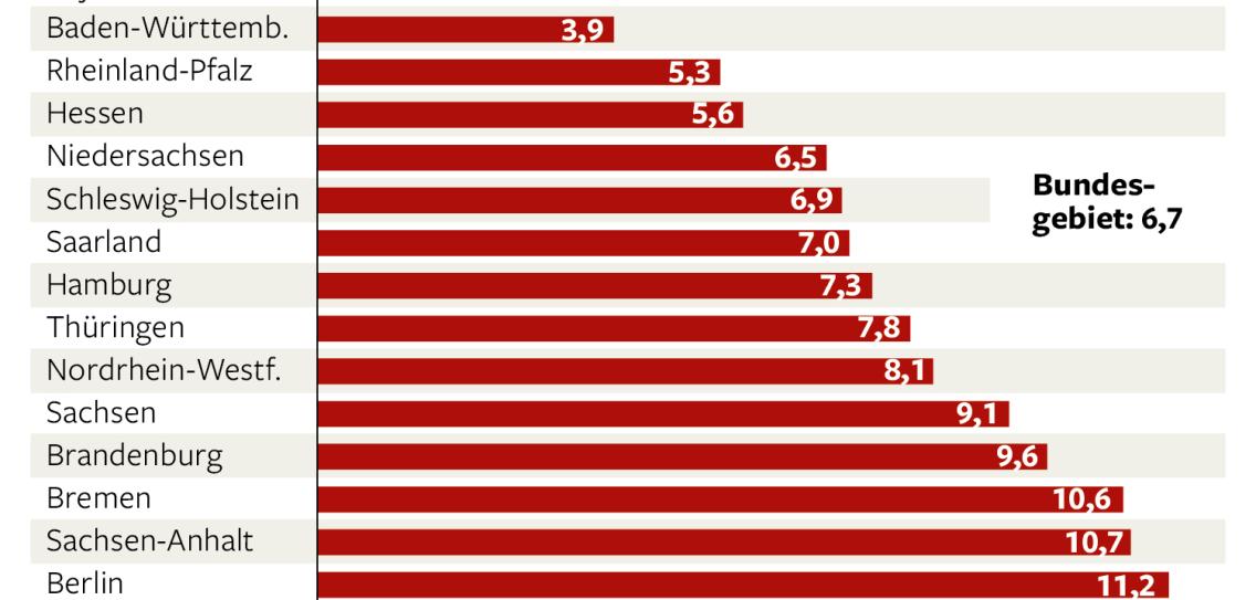 德国南部对于高新技术企业来说更有吸引力,这里的就业岗位多,并且工资更高,就业前景也更好,这吸引了其他地区的年轻人前来就业。2014年的调查显示,巴伐利亚州几乎实现了全民就业,但是石荷州、汉堡、北威州等地的失业率超过了联邦德国的平均水平。而柏林作为首都,失业率居然最高,真是全世界仅此一家的水平。
