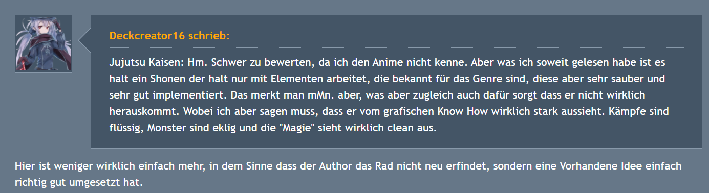 “Hat Jujutsu Kaisen also einen Platz im Shounen-Himmel verdient? Wir entscheiden uns für »Ja«, Jujutsu Kaisen will mehr aus den Story-Elementen machen, setzt sie meisterhaft um und biegt sie sich so zurecht, dass sie für frischen Wind in den altbackenen Tropen sorgen. Jujutsu Kaisen ist cool, witzig, spannend, und überzeugt uns auf ganzer Linie– ein Kunststück, das nicht alle Shounen-Serien so leicht schaffen.”