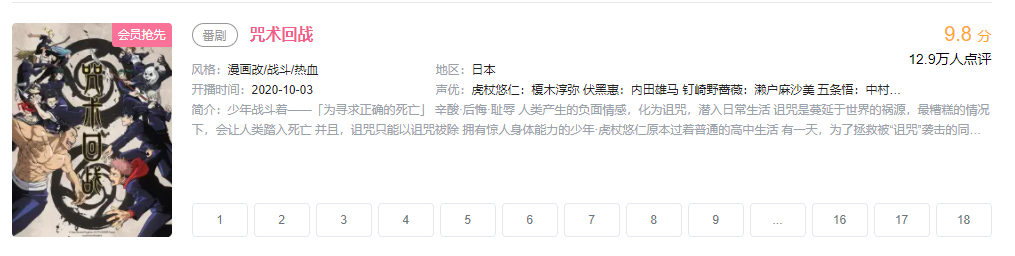 《咒术回战》是日本漫画家芥见下下的作品,2018年3月在漫画杂志《周刊少年Jump》开始连载,截至2月6日已更新至137话。由漫画改编的同名动画从去年10月起播映,截至2月18日已有18集可供观看,b站评分高达9.8。