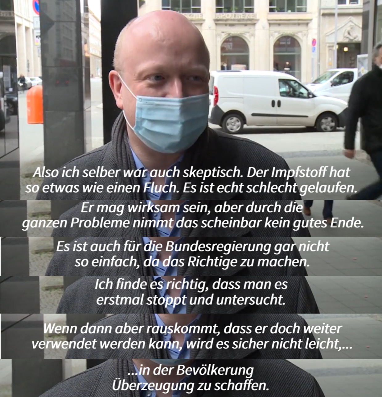 “因为阿斯利康疫苗和其他疫苗一样很快就得到了批准,现在必须要进行调查。只有调查清楚那些不良反应的案例并不是由疫苗引起的,才能再次获得信任。”(65岁,来自开姆尼茨)
