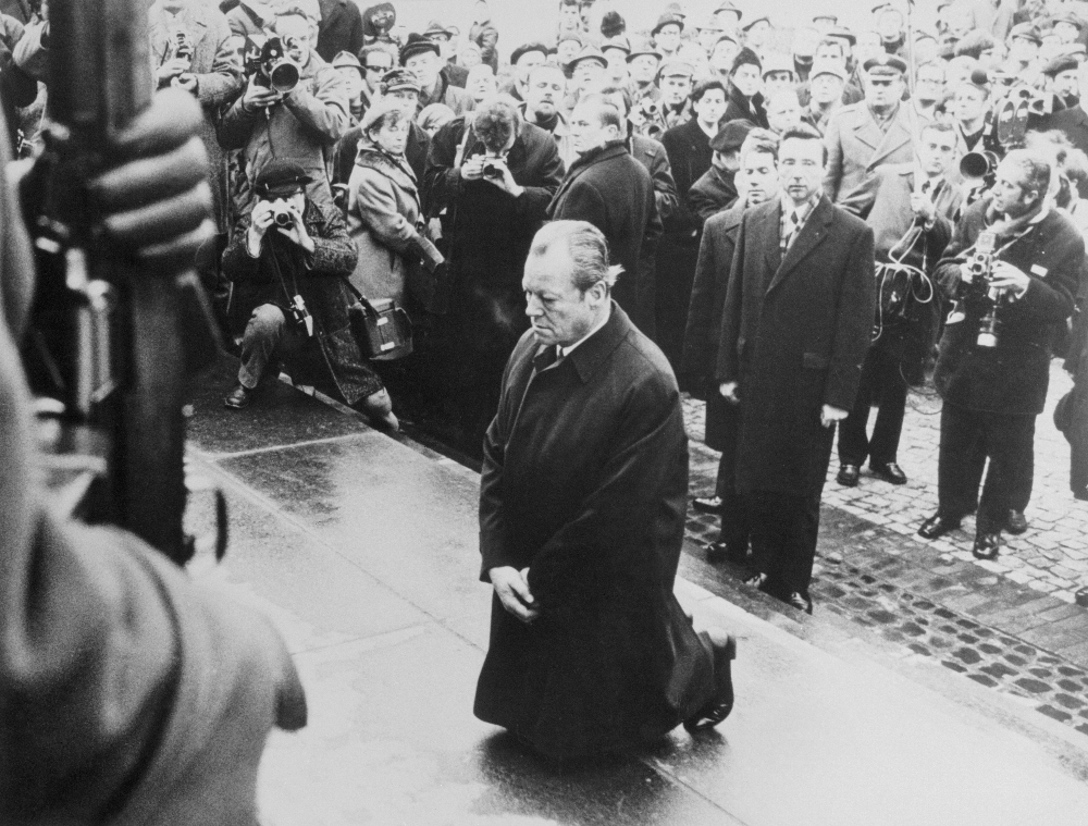 时任联邦总理的维利·勃兰特在华沙的犹太人起义纪念碑前敬献花圈时突然下跪。这一举动事先未经任何安排却带来了巨大的反响。这一跪也拉开了德国政府承认战争罪行,并积极反思、道歉的序幕。勃兰特此行签订了《德波协议》,明确了德国与波兰的边界。值得一提的是,在这份协议中还包含了向有志前往西德留学的波兰人提供奖学金的内容。