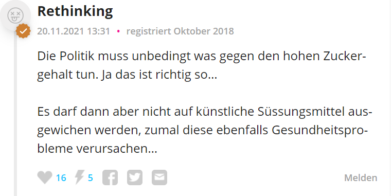 国家政策绝对要对高糖含量做些什么。是的,这是正确的... 然而,不应该使用人工甜味剂,特别是因为它们也会导致健康问题...