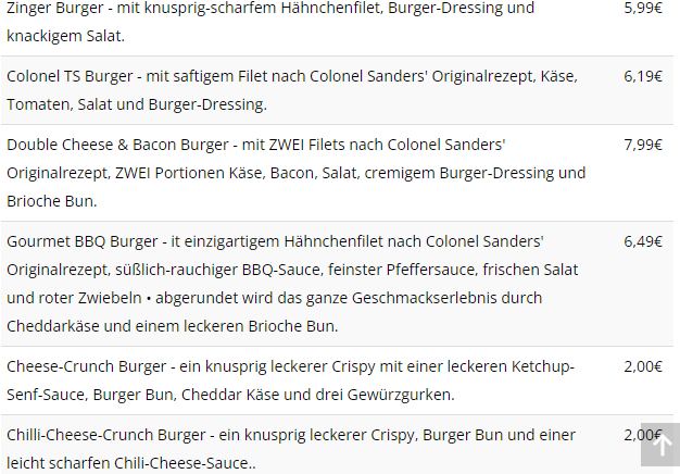 德国的肯德基和麦当劳卖的吃食并不撞车,比如麦当劳根本不卖炸鸡、鸡翅鸡腿这类。原料不同,定价自然不同。根据两个品牌提供的菜单,麦当劳的单个汉堡平均售价4-5欧,而肯德基为5-6欧。
