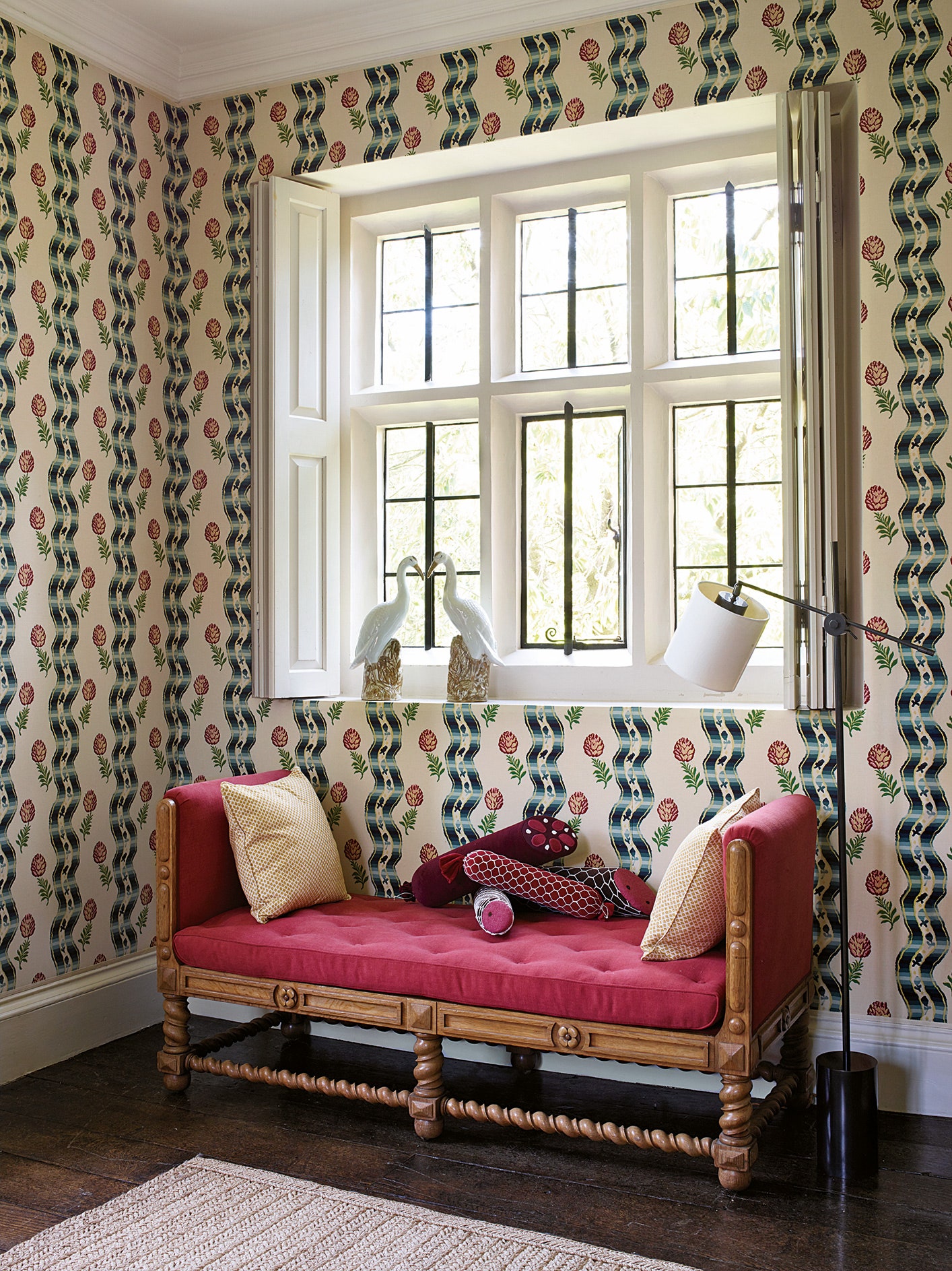 在大多数客房的墙壁上,Claudia选择了传统的主题,可以看到一个房间里有生命树图案的织物,而另一个房间里有果园样式的墙纸。在她的要求下,另一间卧室从地板到天花板都被深红色莲花墙纸包裹着,在那里会让人感觉自己在一个帐篷里。