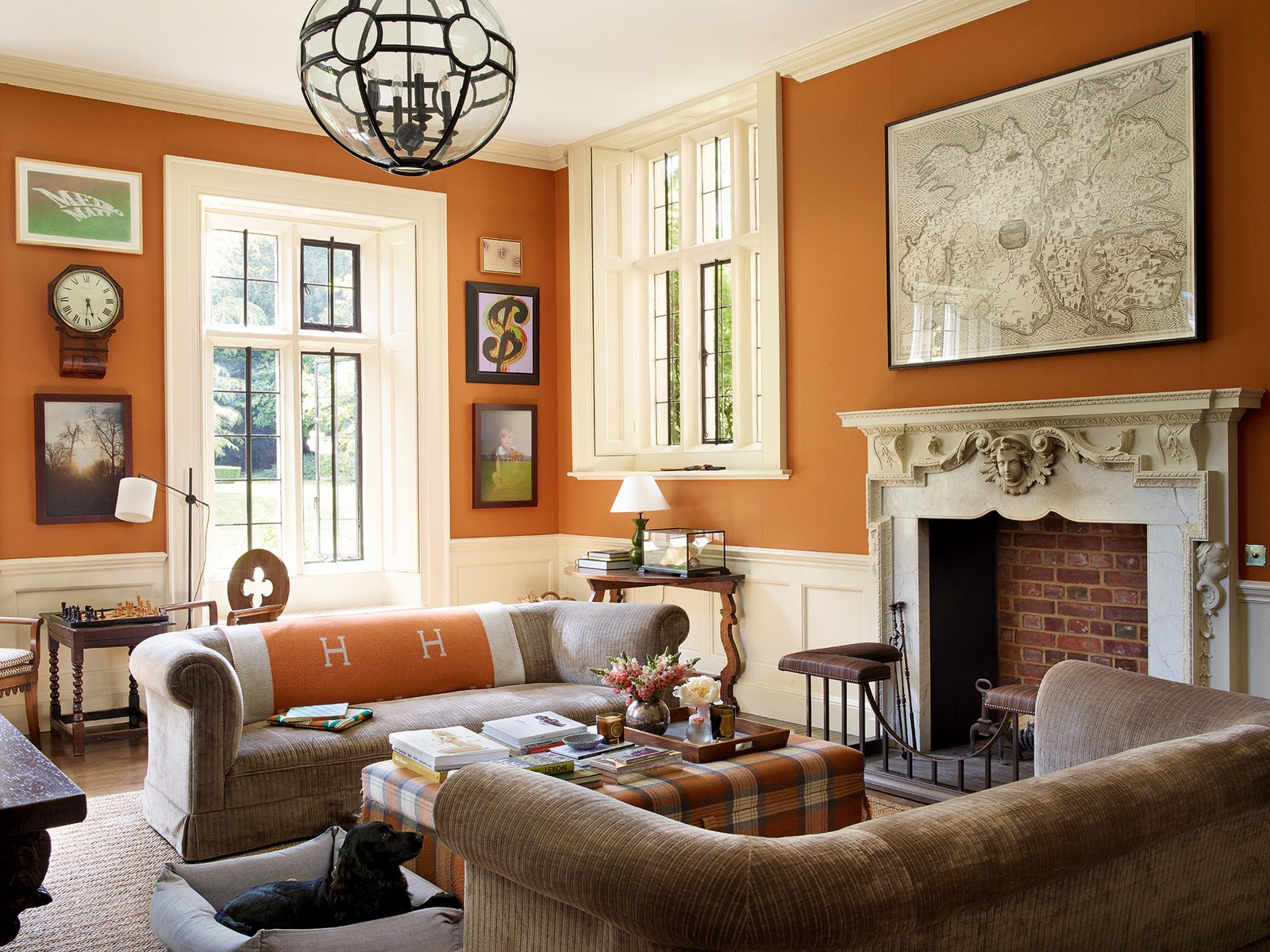 家庭影院的扶手椅采用了爱马仕的面料,墙上挂着卢西恩-弗洛伊德(左)和彼得-比尔德(最右边)的作品。在书房里,我们能看到格雷森-佩里2004年创作的具有讽刺意味的《英国人的地图》悬挂在壁炉上方。
