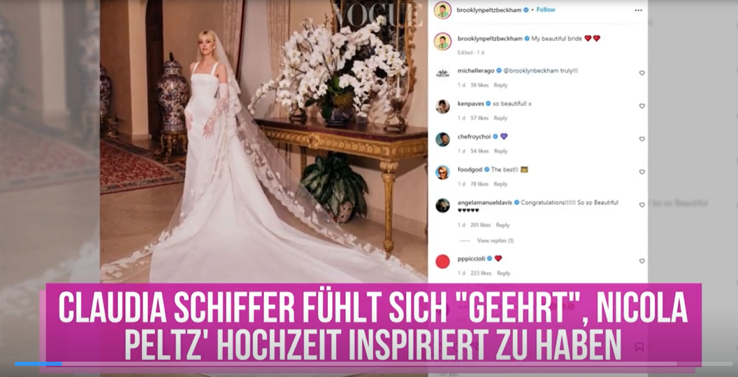 2002年5月25日,活跃在90年代的德国超模克劳迪娅·席费尔(Claudia Schiffer),与英国电影制片人、导演马修·沃恩(Matthew Vaughn)在英国萨福克郡的辛普林(Shimpling)某个乡村教堂举办了婚礼,据报道,这是一个令人惊叹的仪式,美丽的新娘穿着著名的华伦天奴婚纱,价格超过16万欧元。而前一阵贝克汉姆的大儿子与白富美Nicola Peltz结婚时,新娘的造型也是致敬了Claudia。