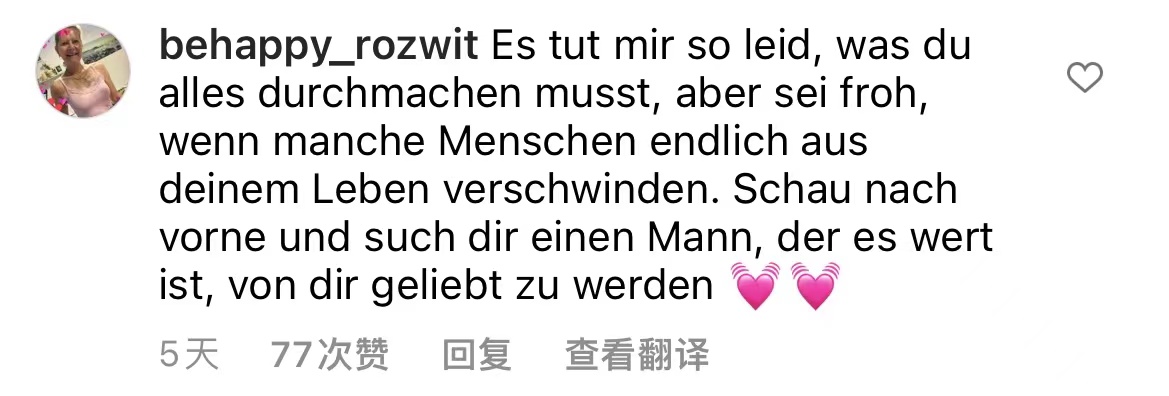 “对于你所经历的事,我很抱歉。但当某些人走出你的生活时,要高兴。往前走,找到一个值得被你爱的男人。”