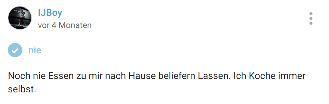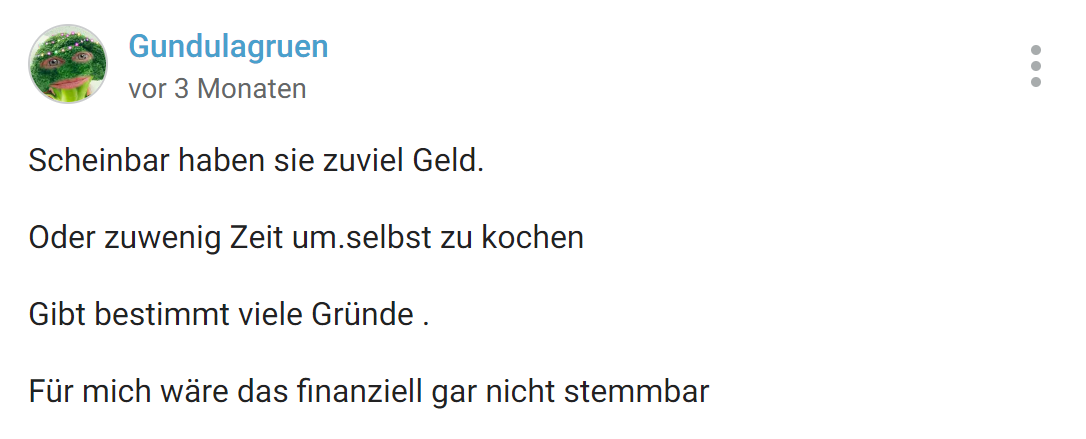 尽管如此,还是有很多德国人鲜少点外卖,高昂的费用成为最大的阻碍。在德国的知乎上有些网友对外卖的质量表示担忧,有些则是对外卖的高额费用表示有负担,还有人就是喜欢自己下厨: