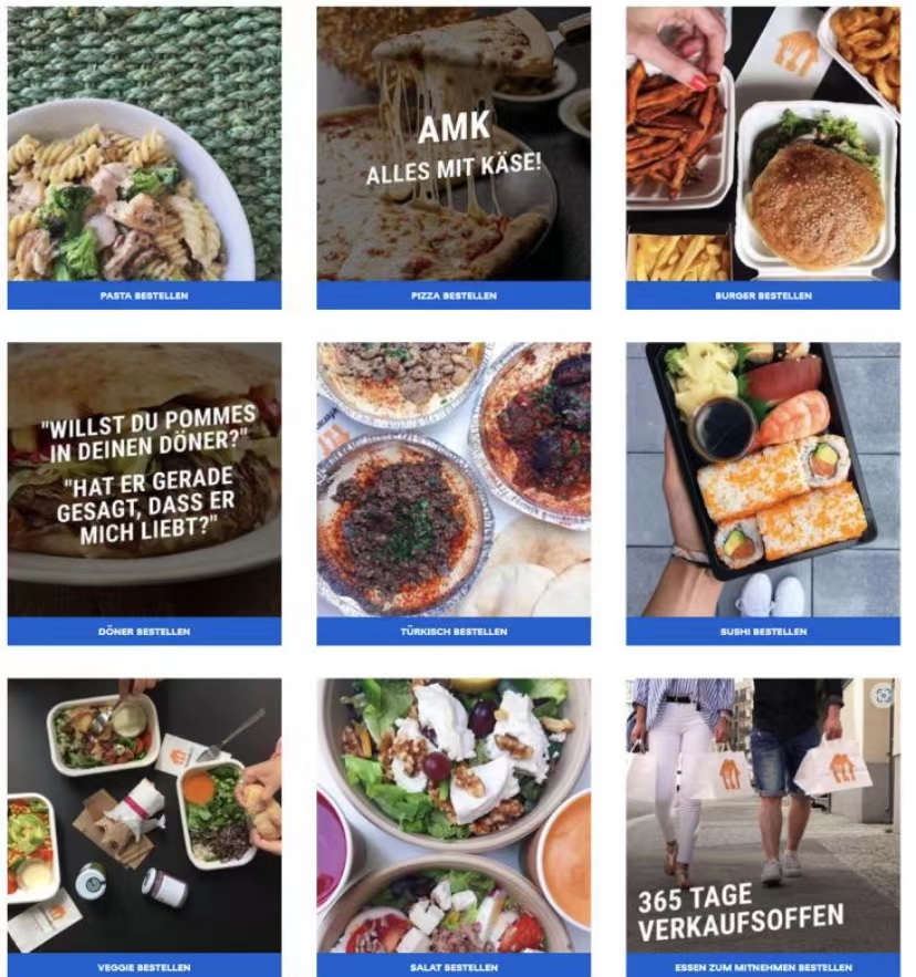 德国版的饿了么Lieferando主页上的美食琳琅满目,除了常见的美式快餐汉堡炸鸡薯条以外,意大利菜、土耳其菜、中国菜以及日本寿司都是外卖领域的常青树。人们可以在平台上轻松下单披萨、意大利面、土耳其菜、Döner和寿司,中国的北京烤鸭、宫保鸡丁、春卷、粤式点心等在大城市也随处可见。另外考虑到素食主义者的饮食习惯,Lieferando还设置了Veggie区域。