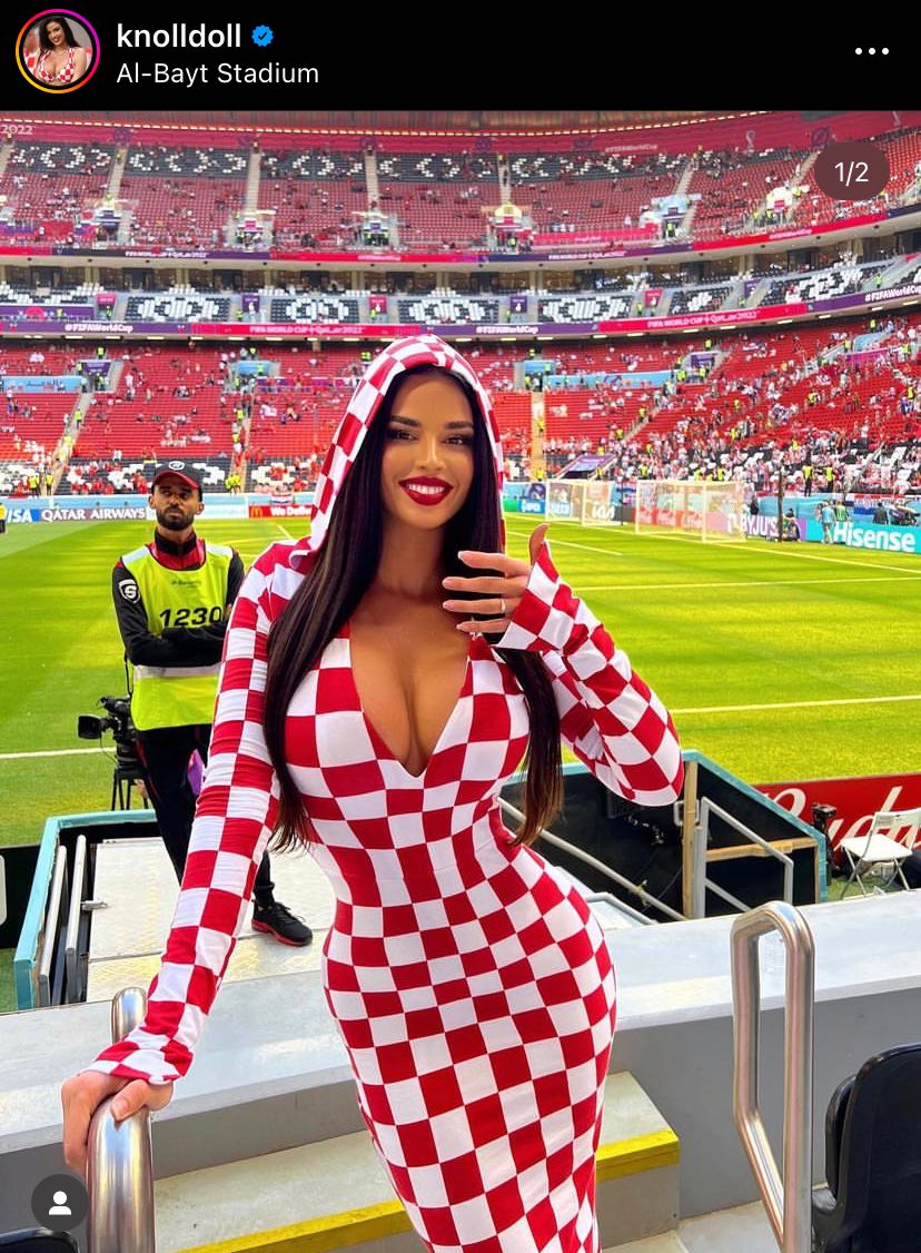 从衣着颜色不难看出,这是“格子军团”克罗地亚队的粉丝。美女名叫Ivana Knöll,今年30岁,一直在美国做模特、网红和演员的工作。作为前克罗地亚小姐,她在Ins上的粉丝早就有60万,而这次在世界杯期间的亮相,她因性感的装扮让体育场内的球迷们为之疯狂,粉丝数直接暴涨到170万,她发的每条动态都有100多万人观看,甚至连她支持的克罗地亚队球员也关注了她。