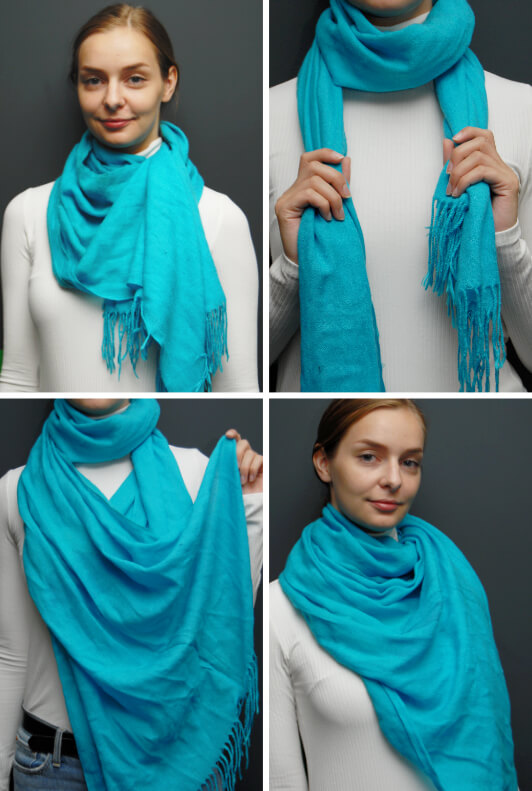 1. Um dein Schaltuch zu binden, lege es als lockere Schlaufe um deinen Hals.