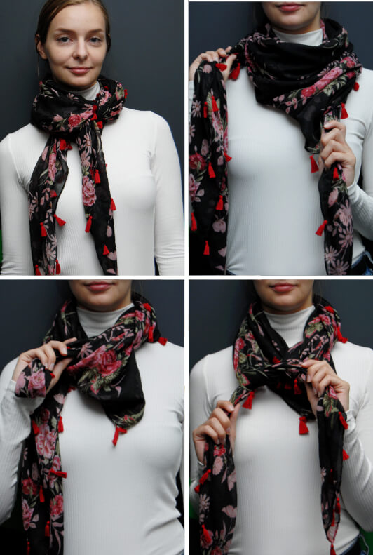 1. Für diese Variante legst du Schal oder Tuch in einer lockeren Schlaufe um den Hals.