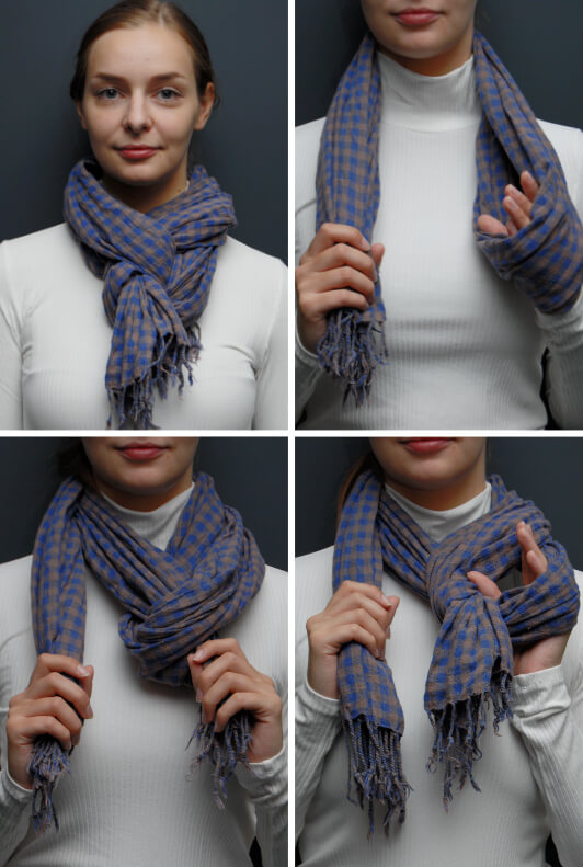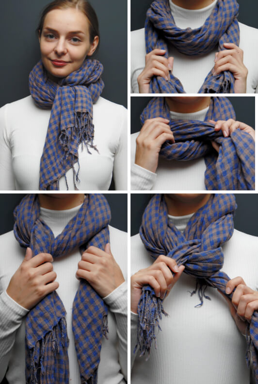 1. Um den dicken Schal zu binden, lege ihn um deinen Hals und mache zunächst einen einfachen Knoten.