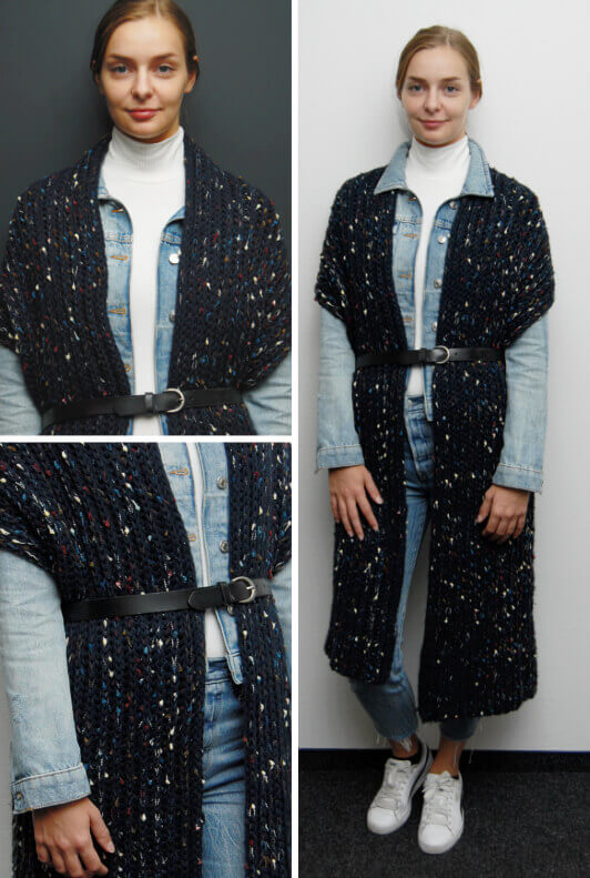 1. Lege den Schal breitflächig um deine Schultern und binde ihn an der Taille mit einem Gürtel zusammen.