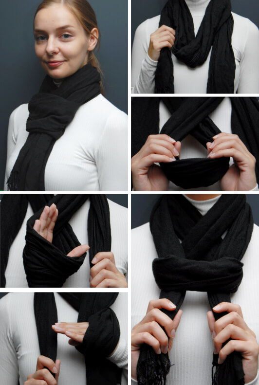 用一只手从下方伸进8下方的圈,然后将围巾一端拉过去。