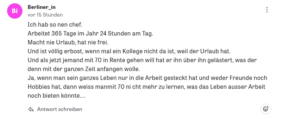 而现在当有人想在 70 岁退休时,他直接中伤那人,说他想要那些时间做什么。