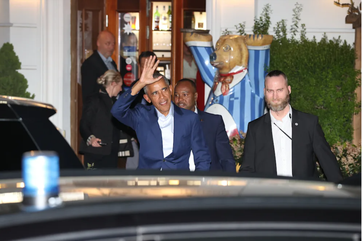 奥巴马面带微笑离开餐馆