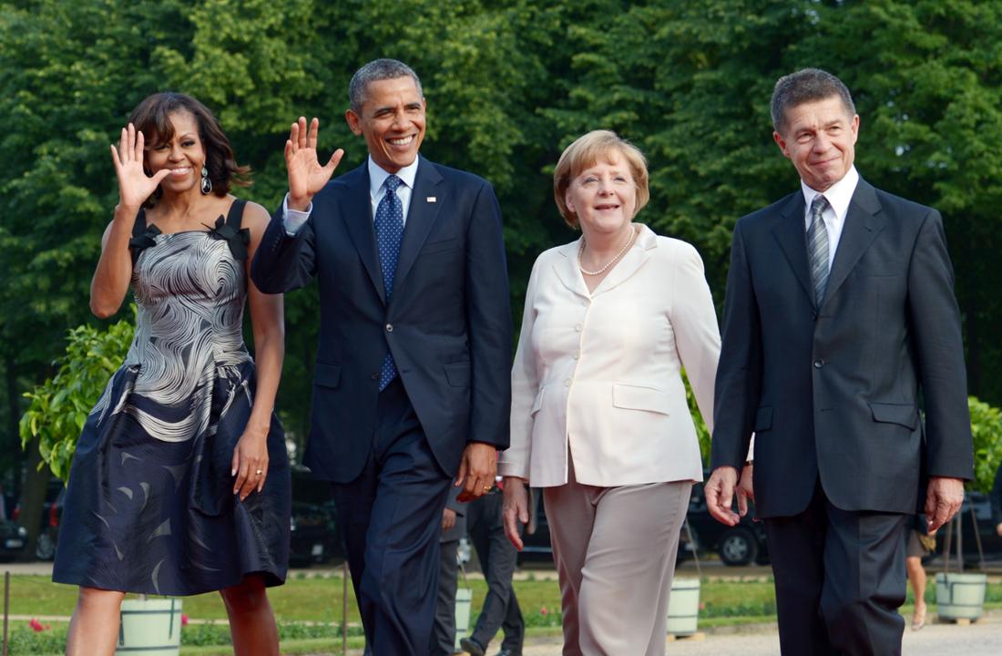 2013年6月18日,奥巴马和他的妻子米歇尔、默克尔和她的丈夫绍尔,来到柏林的夏洛滕堡宫参加晚宴。