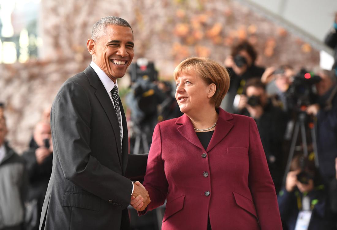 2016年11月18日,在法国、意大利、英国和西班牙国家和政府首脑与奥巴马会面之前,奥巴马和默克尔在柏林联邦总理府前握手。