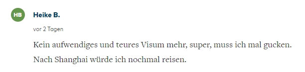 “再也不用又麻烦又贵的签证啦!我必须要去看看!我会再次去上海旅行的!”