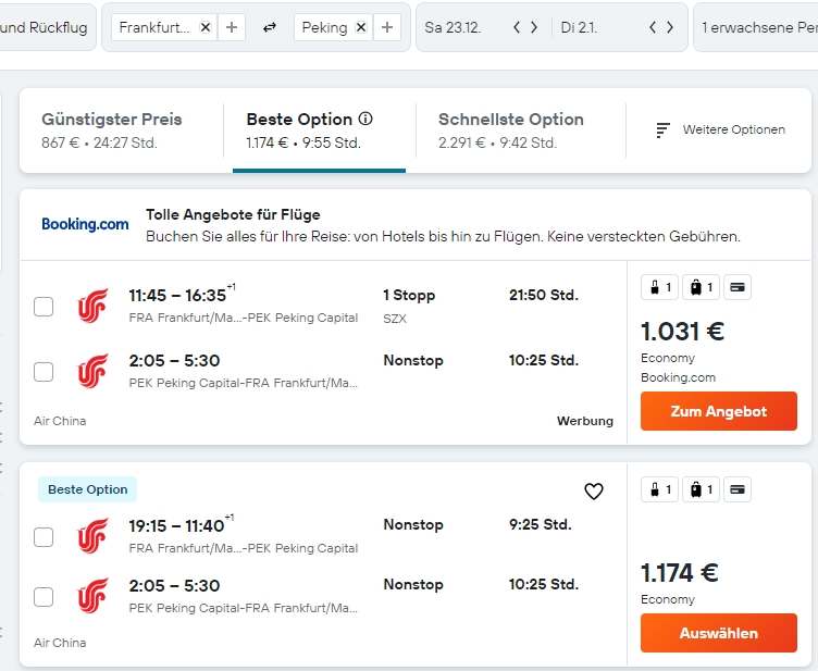 根据Kayak网站,按照德国人的传统圣诞度假日期来看,目前从德国法兰克福飞往中国各个热门城市的往返航班价格大概是这样的: