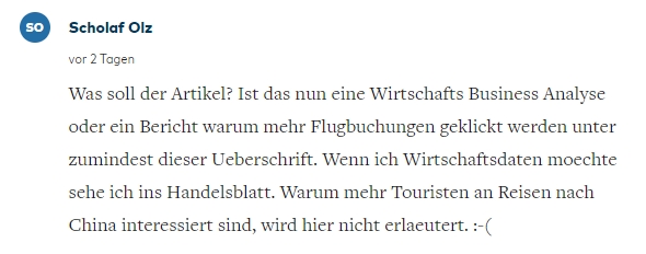 “所以这篇文章到底想说啥?是经济商业分析报告,还是说为啥会有更多去中国的航班被预定了?我要是想知道经济数据的话我就去看商业报纸了好伐。你们根本没解释为什么会有越来越多的游客想去中国旅行!”