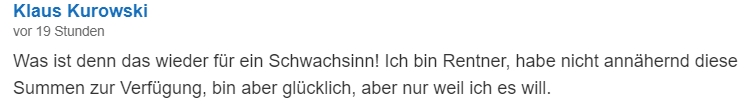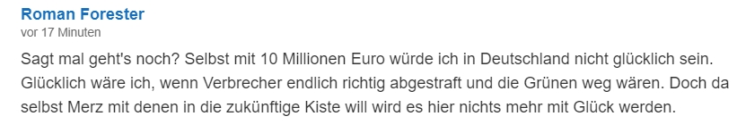 “这是什么鬼?就算给我1千万欧元,在德国我也不会快乐的。我会快乐的唯一方式就是犯罪者得到应有的惩罚,而绿党消失无踪。可是连默兹弗里德里希·默兹Friedrich Merz是一位德国基民盟党政治家)都想跟他们搞好关系,未来的前景看来很悲观,快乐还能指望什么呢?”