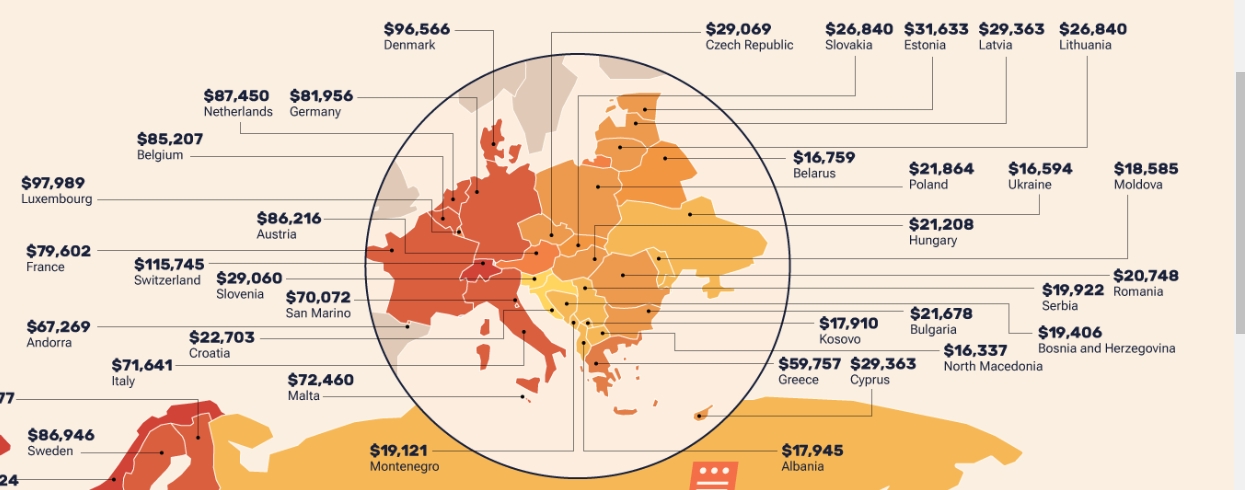 相比之下,东欧国家的幸福成本较低:捷克共和国约为27,000欧元,波兰约为20,000欧元。